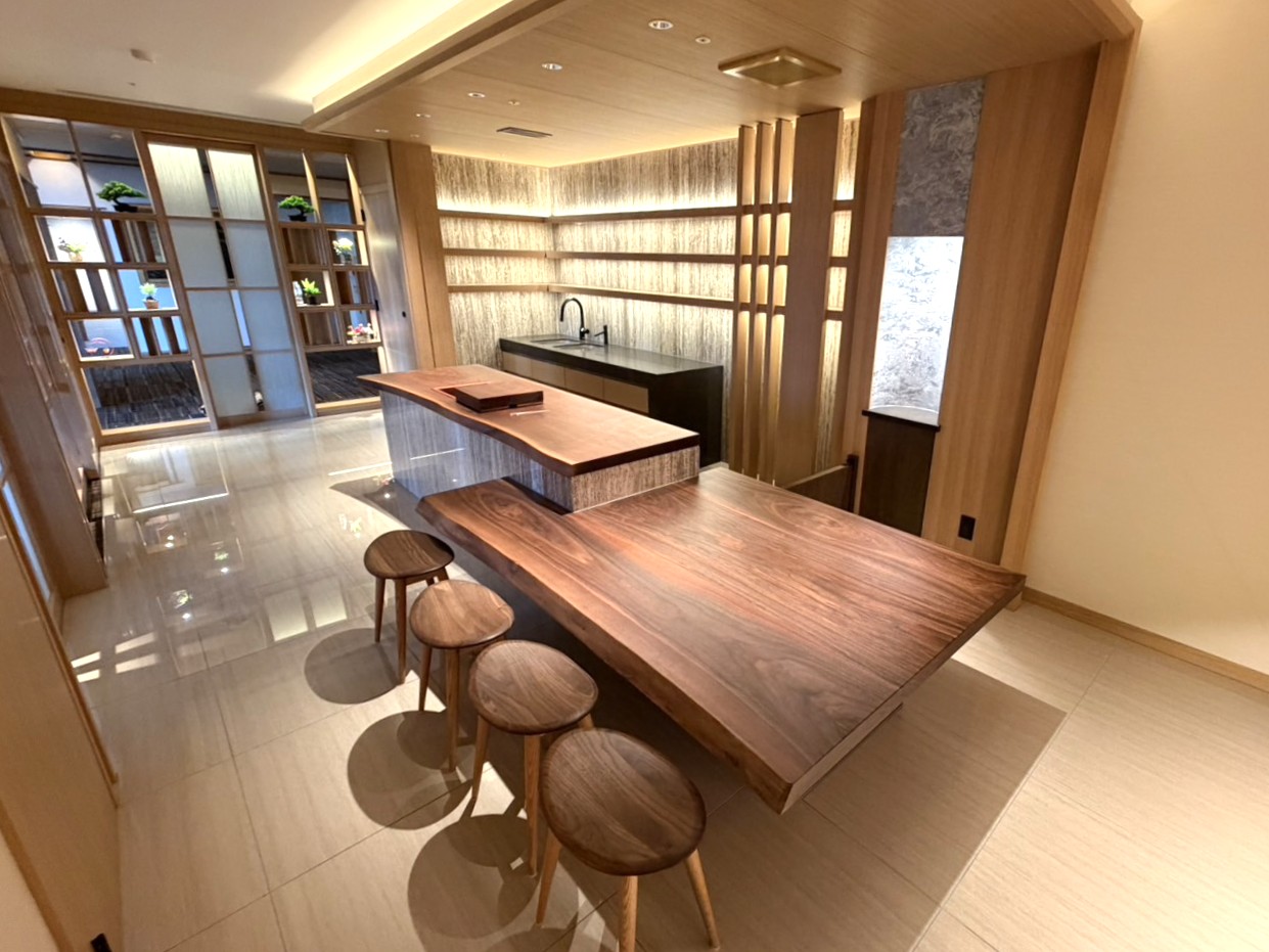 旧喫茶スペースとカラオケ室は、現代的なデザインを取り入れた立礼(りゅうれい)茶室として新たに生まれ変わりました。畳ではなく椅子とテーブルで行う立礼式は、伝統と快適さを融合させ、日本のおもてなしの心を肌で感じられる空間となっています。海外からのお客様にも、英語による茶道の解説をご用意しており、文化体験をより深く楽しんでいただけます。