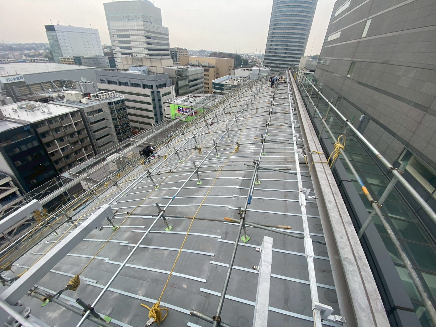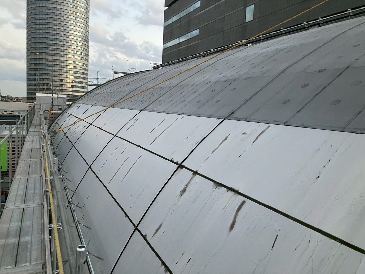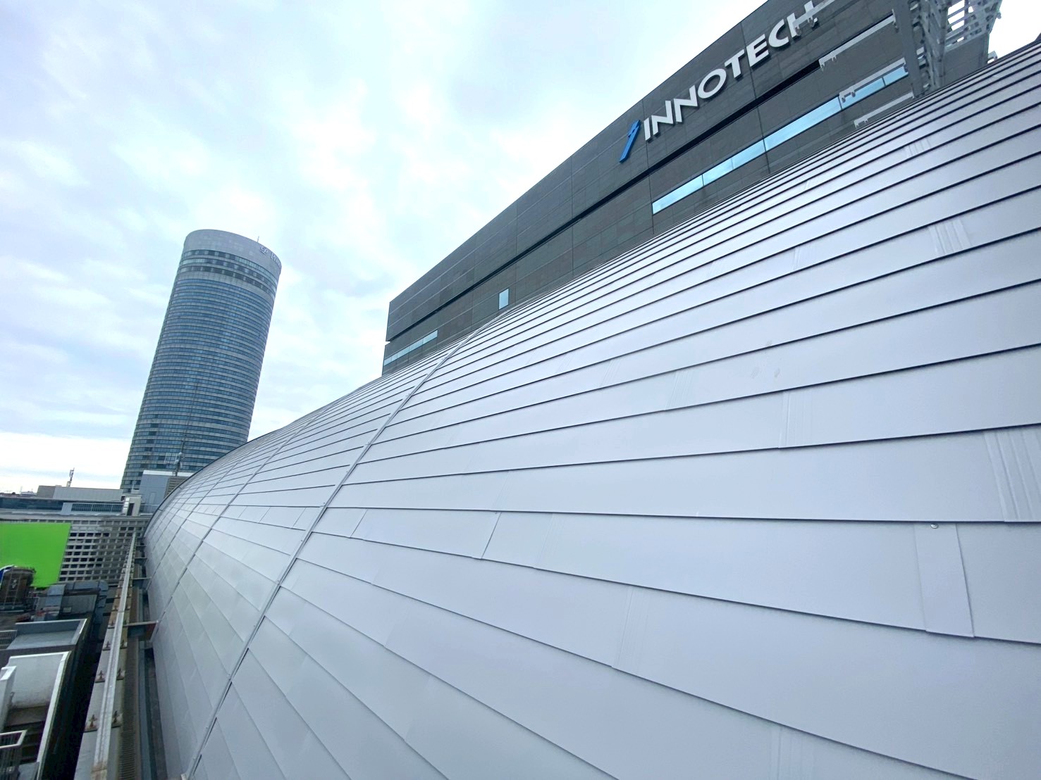 イノテック本社ビルにて、テニスコート上部R屋根漏水によるR屋根葺及び内部天井貼替・外壁シーリング打替・ガラストップライト部新規シート防水の改修工事を実施しました。安全対策と周辺環境への配慮を徹底し、既存構造の状態に応じた最適な工法で改修を行いました。工事期間中も建物利用への影響を最小限に抑え、品質と安全を両立した施工を実現しています。